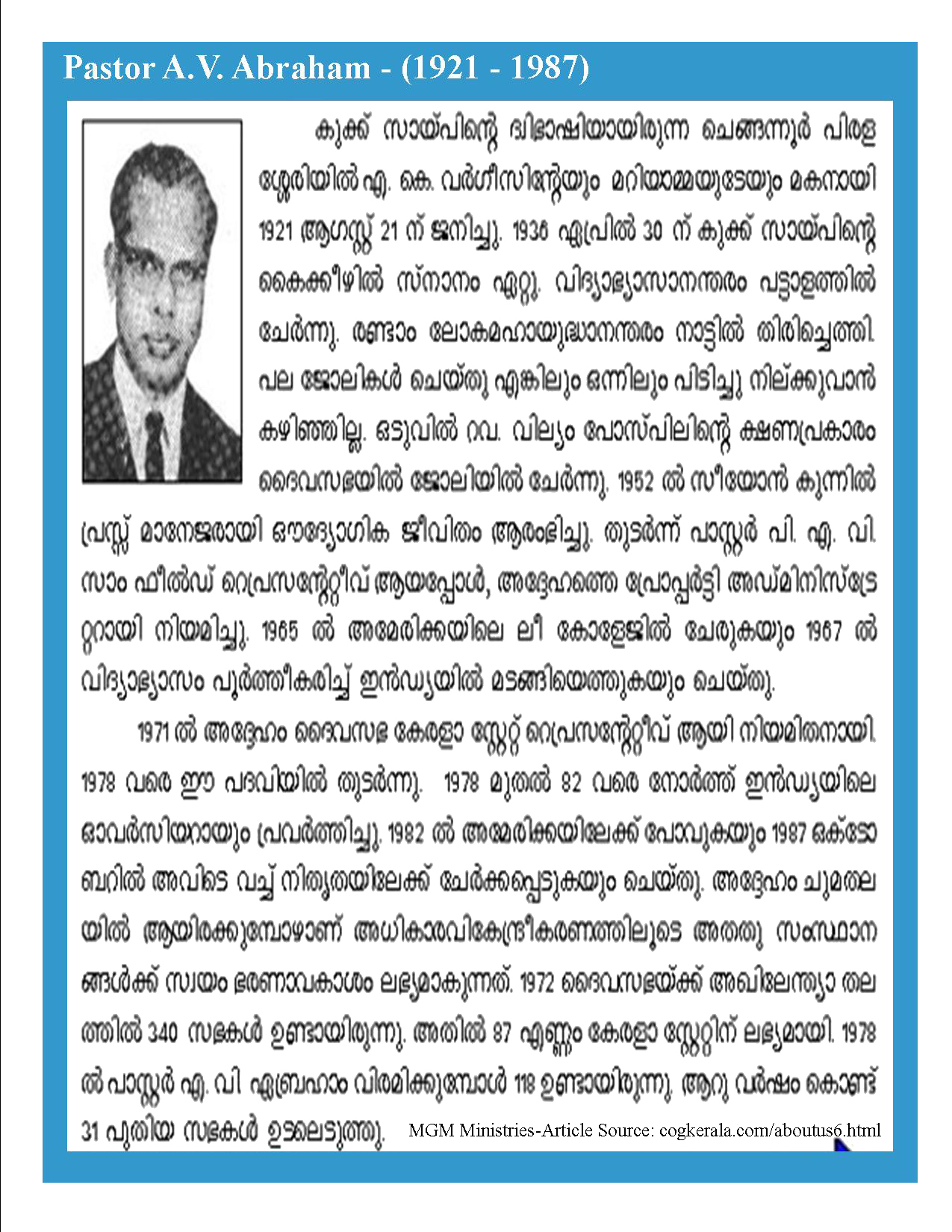 Pastor A V Abraham in Leaders of Pentecostal Faith Play Pause Unmute Mute MGM Ministries-Article Source:cogkerala.com/aboutus6.html – (Accessed in October 2011)
